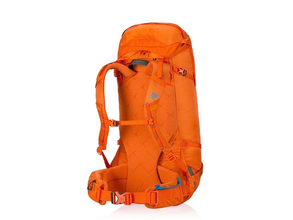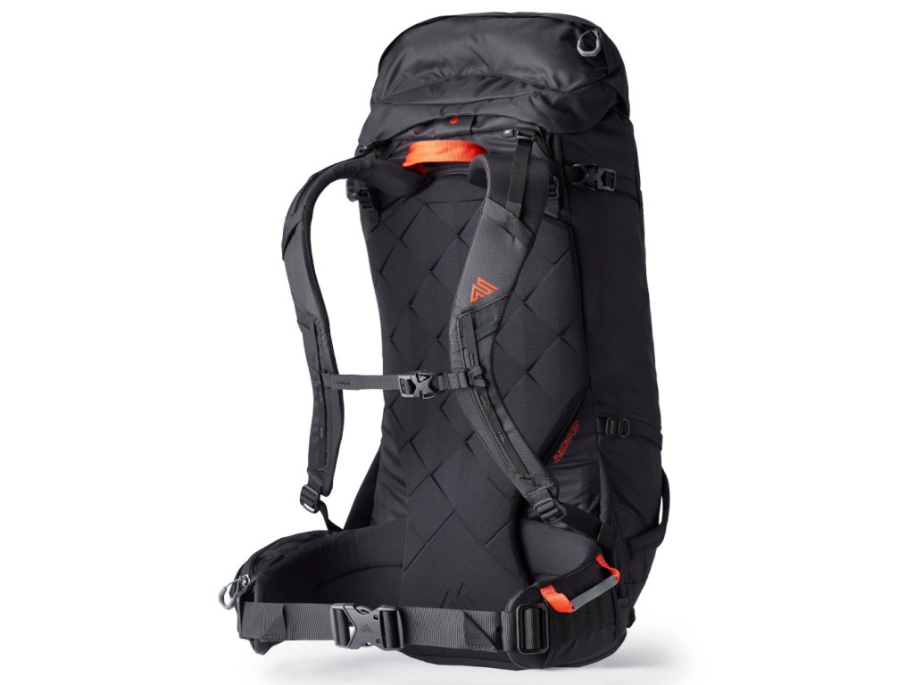 Pomocí kompresních popruhů lze k batohu snadno připevnit lyže a hůlky. To nám umožní aktivně trénovat alpské lyžování. Díky speciálním úchytům na přední straně batohu si s sebou do hor můžeme vzít ledovce. Odnímatelný bederní pás nám umožní snížit hmotnost batohu, ale když se s ním rozhodneme vyrazit do hor, poslouží jako lezečka a kapsa na přední straně pojme praktické věci. Na přední straně tohoto modelu je také vyztužená kapsa na mačky. Vzhledem k jejich ostrým hranám použili designéři Gregory odolný materiál, který batoh chrání před poškozením. Podobná výztuž se nachází v místě, kde jsou umístěny šeky.