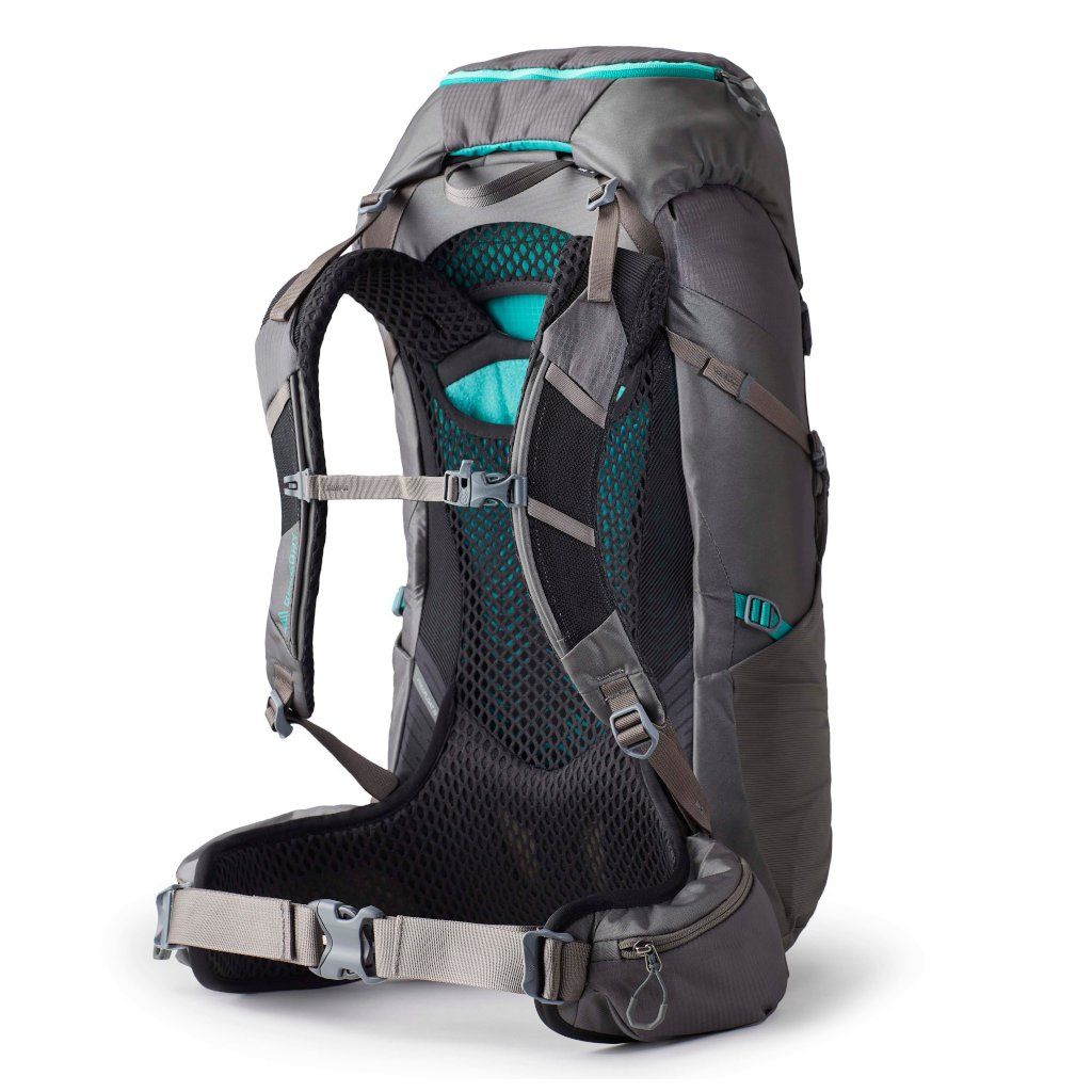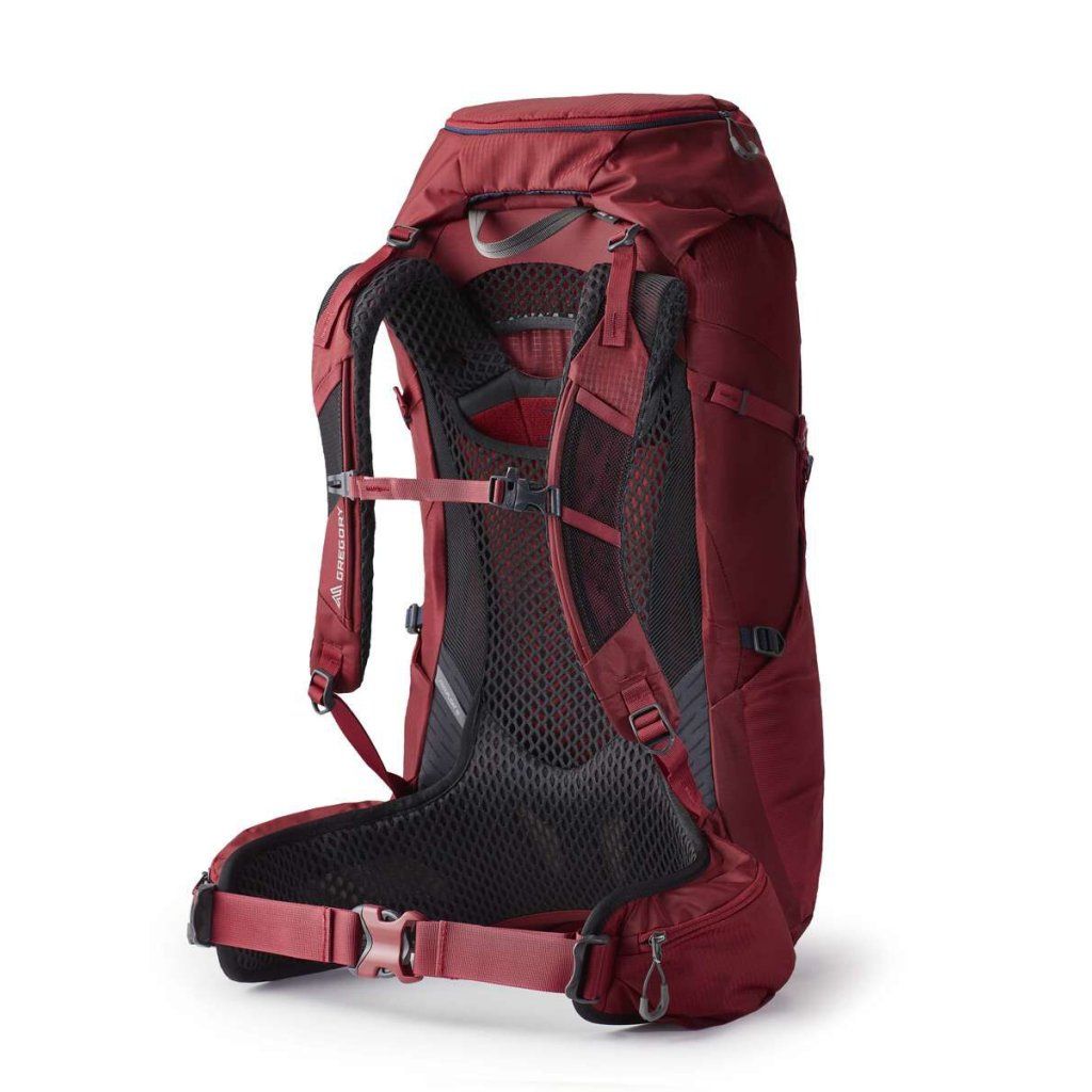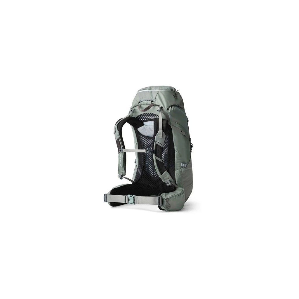 Dámský turistický batoh Jade 33 od značky Gregory přichází s revolučním zádovým systémem FreeFloat. Tento systém poskytuje maximální ventilaci díky zcela otevřenému zádovému panelu a velmi prodyšnému bedernímu pásu. Ergonomicky tvarované ramenní popruhy jsou polstrované, avšak také velmi prodyšné. Lze je spojit výškově nastavitelným hrudním popruhem s bezpečnostní píšťalkou.