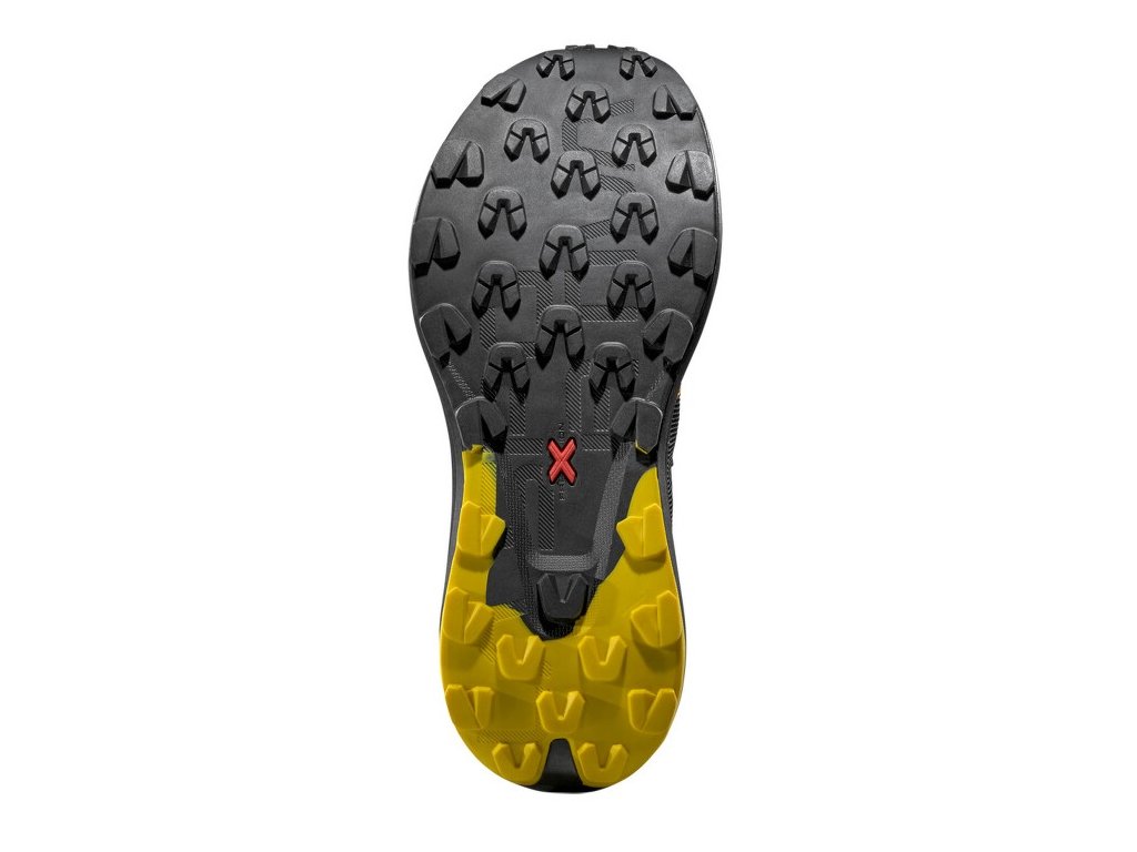 Základem boty je inovativní mezipodešev XFlow™ Endurance, která kombinuje vysokou úroveň tlumení, odolnost a stabilitu. Zvýšené tlumení (37 mm pata / 31 mm špička) chrání nohy před únavou a nárazy, a to i při běhu na tvrdém povrchu nebo v kamenitém terénu. Stabilní platforma (cca 90 mm pata/ 115 mm špička) vám zaručí jistotu došlapu i v technickém terénu. Podrážka FriXion® Red spojuje lepivou gumu v přední části pro jistotu na technických pasážích a odolnější směs v patě pro dlouhou životnost. 4mm špunty poskytují dostatečný záběr na sypkém podkladu, přitom zůstávají komfortní i na tvrdších cestách. Díky této kombinaci se Prodigio Max hodí jak do hor, tak na lesní a šotolinové cesty.