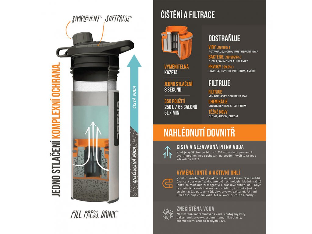 Vysoce účinný filtrační systém, s nímž získáte během pouhých 8 vteřin pitnou vodu vyčištěnou od patogenů (viry, bakterie, prvoci), chemikálií, těžkých kovů i pevných částic. Stačí jenom naplnit láhev vodou (z libovolného přírodního zdroje), stlačit jí a během chvilky máte vodu připravenou k pití. Postará se o to vyměnitelná filtrační kartuše uložená uvnitř láhve, která k odstranění kontaminantů využívá důmyslnou kombinaci aktivního uhlí a elektrostatické adsorpce. S jedinou takovouto filtrační vložkou přitom zvládnete vyčistit 250 litrů vody..