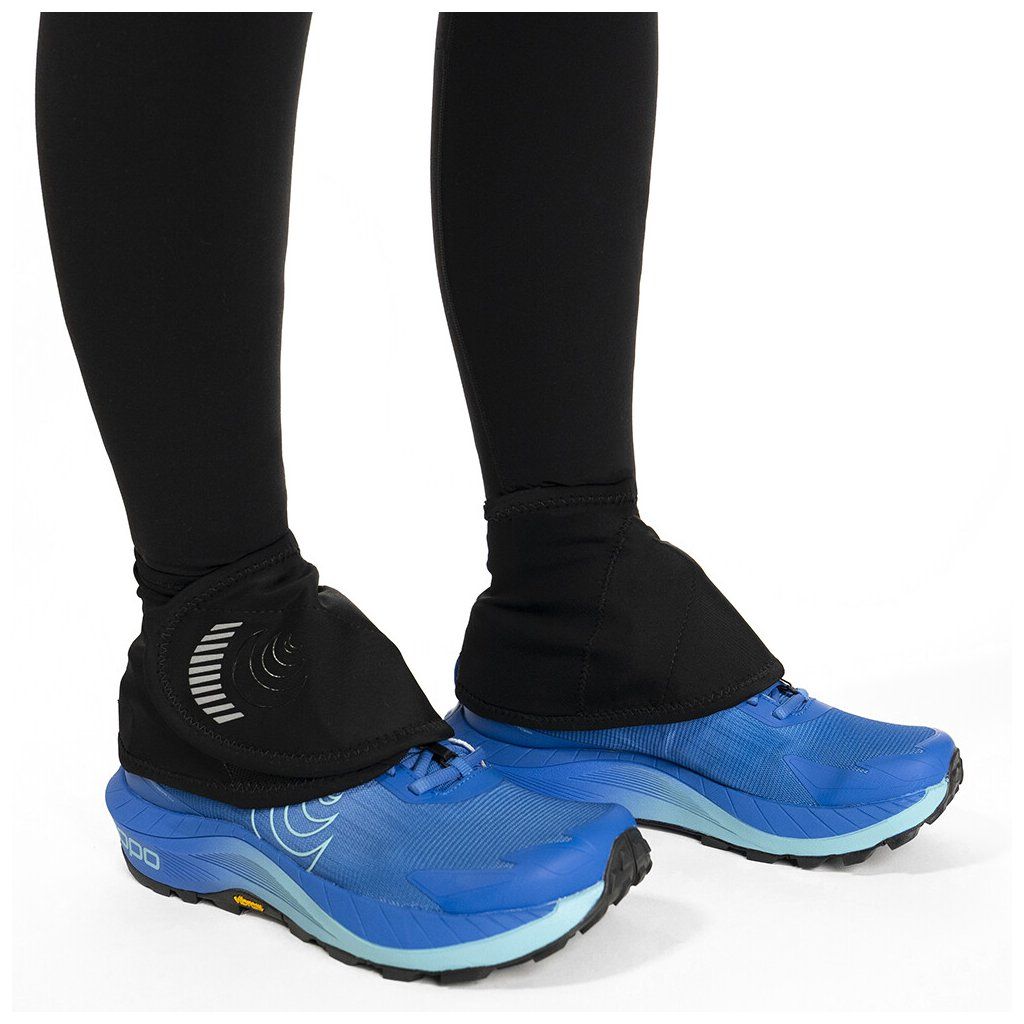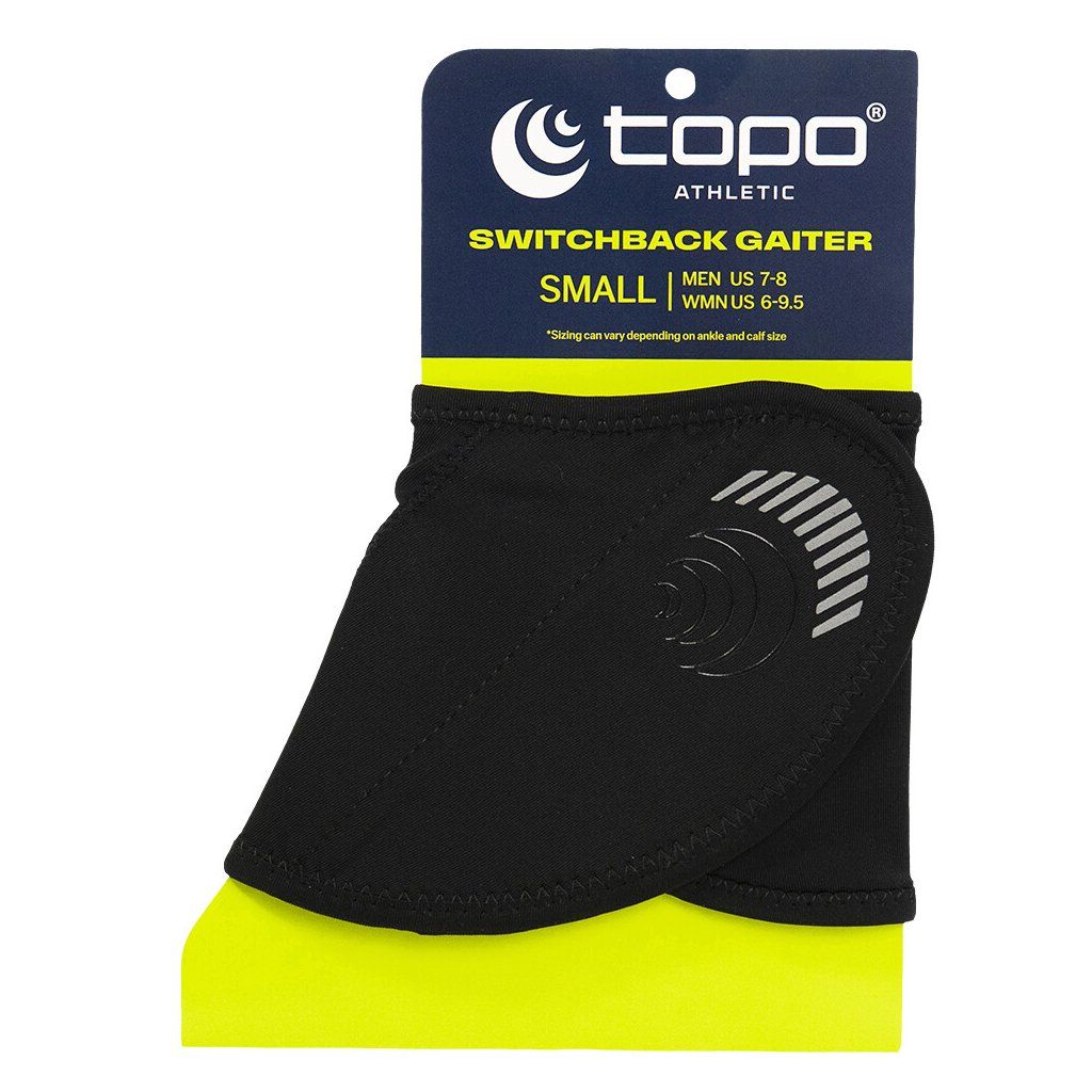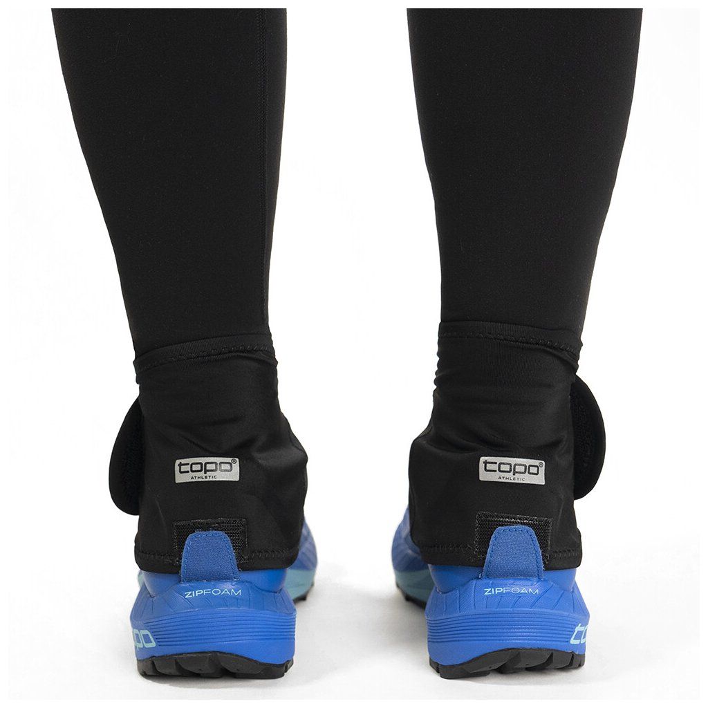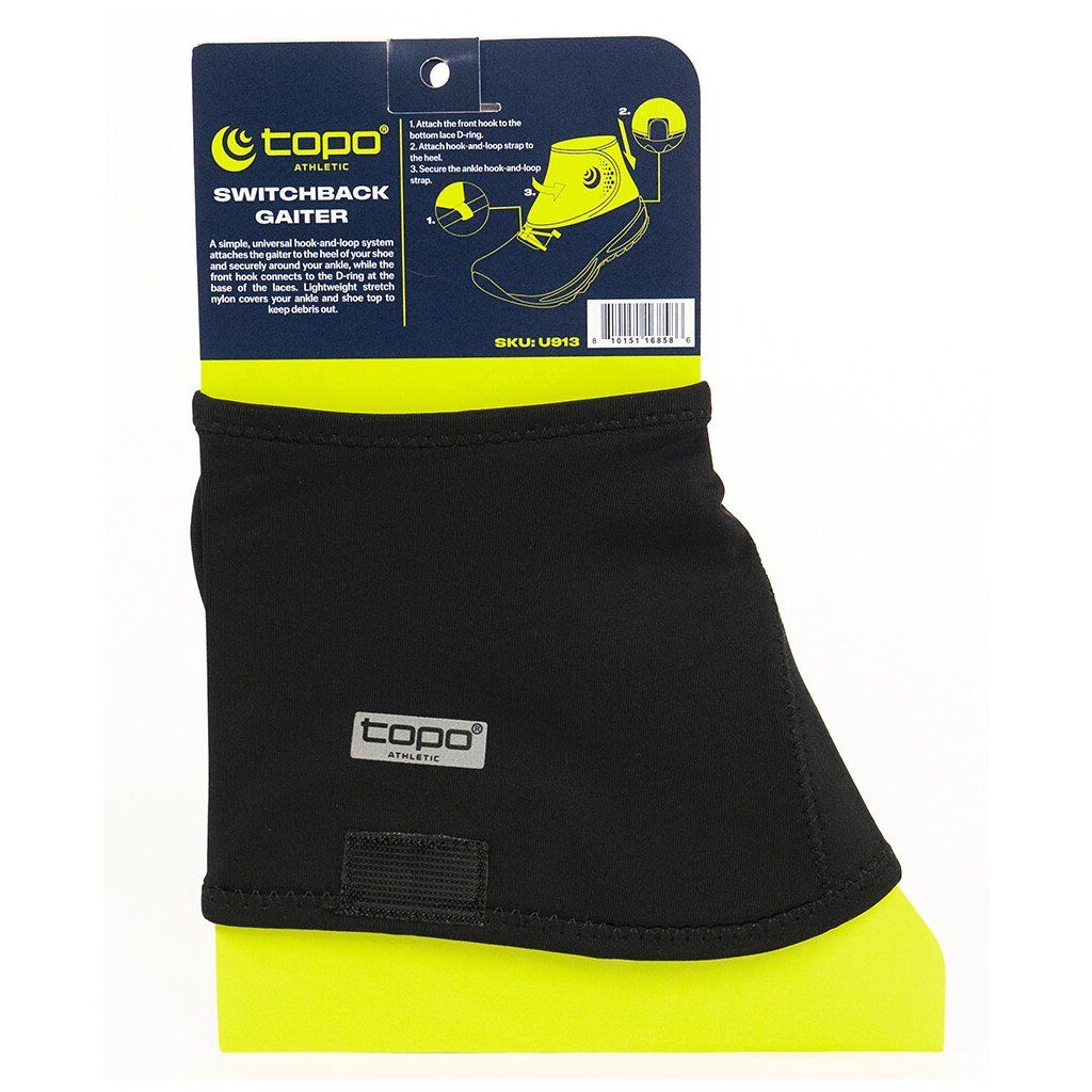 Návleky Topo Switchback Gaiter disponují vylepšeným designem, který umožňuje jejich snadné a rychlé připnutí k běžecké botě. Pomocí suchého zipu lze zajistit pevné spojení s patou boty, zatímco vpředu je návlek fixován pomocí háčku do D-kroužku pod šněrováním.